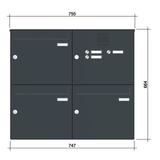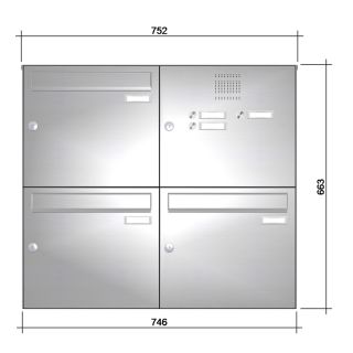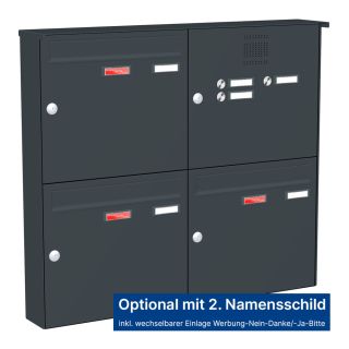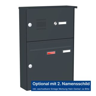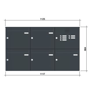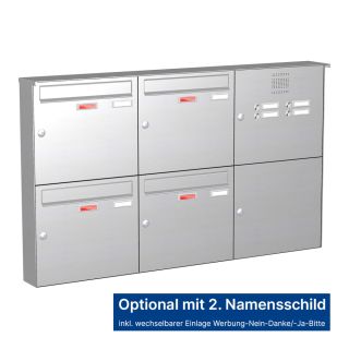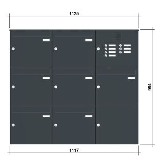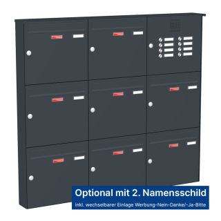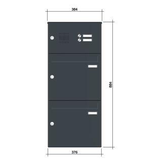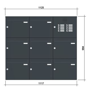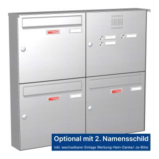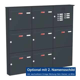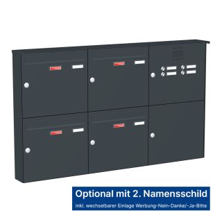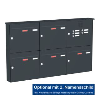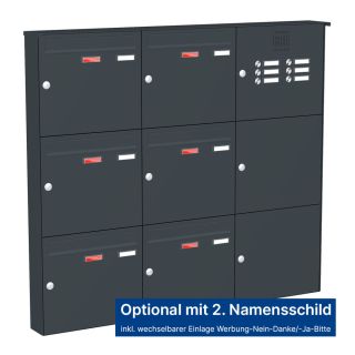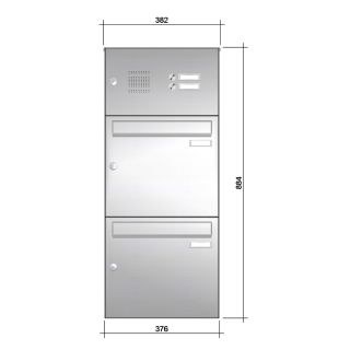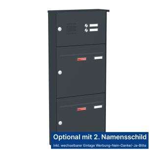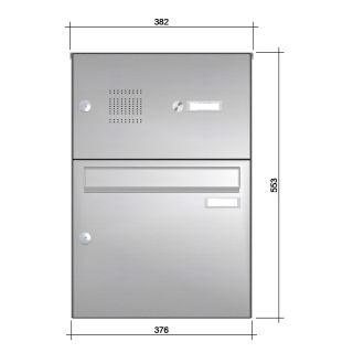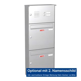 Hier geht es um Briefkästen mit einem zusätzlichen Funktionskasten, der in Größe, Material und Erscheinungsbild perfekt zum Rest passt. Er nimmt Klingeltaster, Namensschilder und Kommunikationseinrichtungen auf. Im einfachsten Fall besteht die Kommunikationseinrichtung aus einem vorbereiteten Sprechsieb, im Normalfall jedoch aus einer Videokamera mit Mikrofon und Lautsprecher sowie den entsprechenden Gegenstellen in den Wohnungen, die hier im Preis bereits mitberücksichtigt sind.