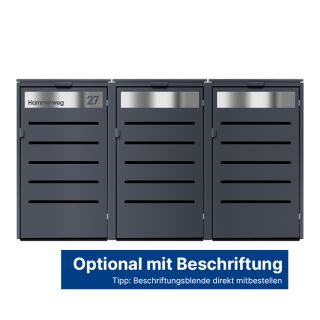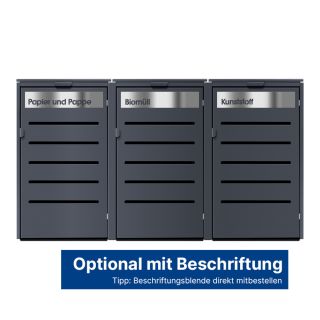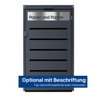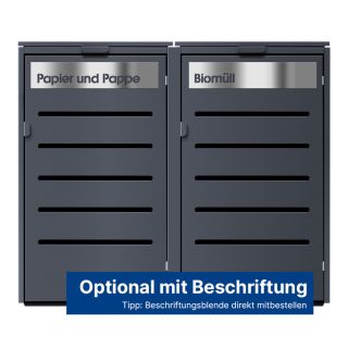 Ein besonderes Highlight sind unsere Beschriftungsblenden, die Sie nach Ihren Wünschen gestalten können: Kennzeichnen Sie die Boxen klar nach Müllart (Papier, Plastik, Bio) oder nutzen Sie die Flächen, um Ihre Straße und Hausnummer sichtbar zu machen – das schafft Ordnung und unterstreicht die gepflegte Optik Ihrer Außenanlage.